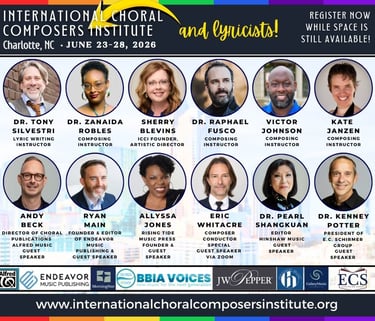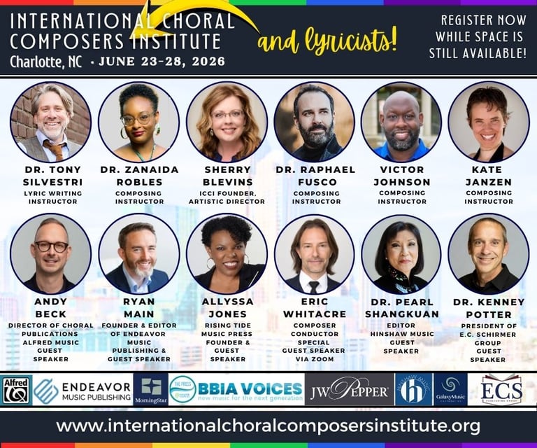 The International Choral Composers Institute (ICCI) is a 5-day immersive program dedicated to nurturing and instructing choral composers and lyricists of all levels while connecting them with real-world editors and publishers.