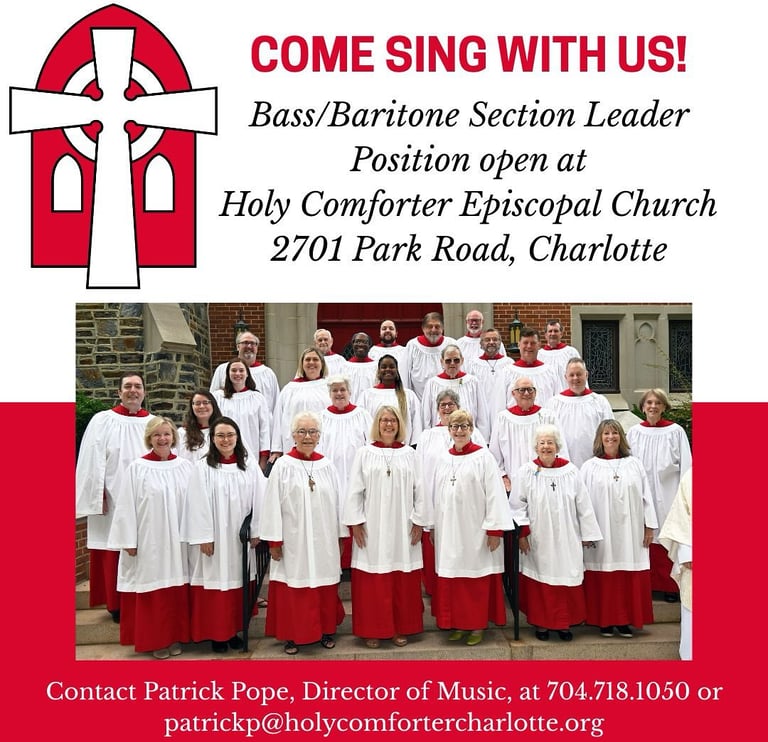The Episcopal Church of the Holy Comforter located in the Dilworth neighborhood of Charlotte, announces an opening for a Bass/Baritone, or Tenor, Choral Scholar position (section leaders) for the academic year 2025-2026. The choral scholars sing in the Holy Comforter Choir, an adult ensemble of approximately 30 voices. The choir rehearses weekly from September-May and sings for the 10:00am service on Sundays. A general overview of the choir’s responsibilities is: